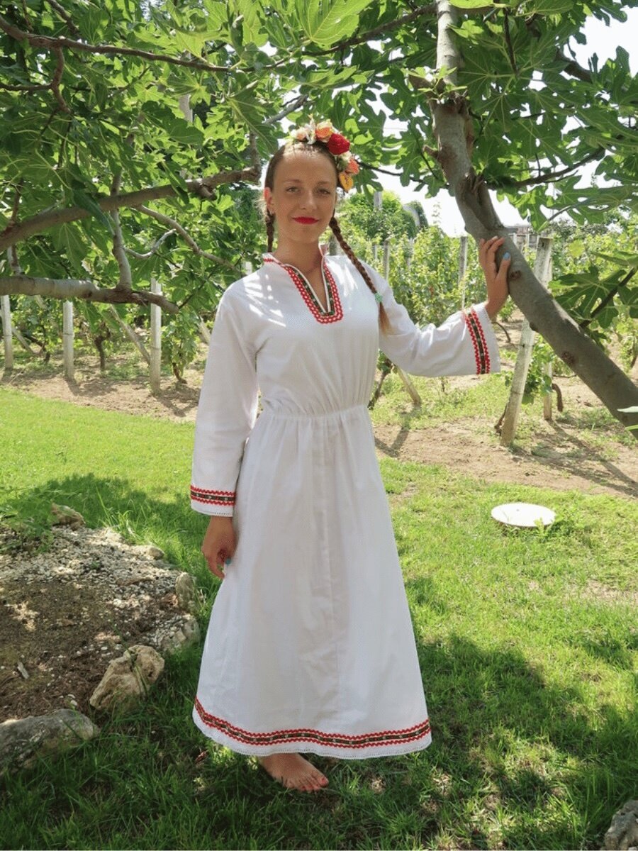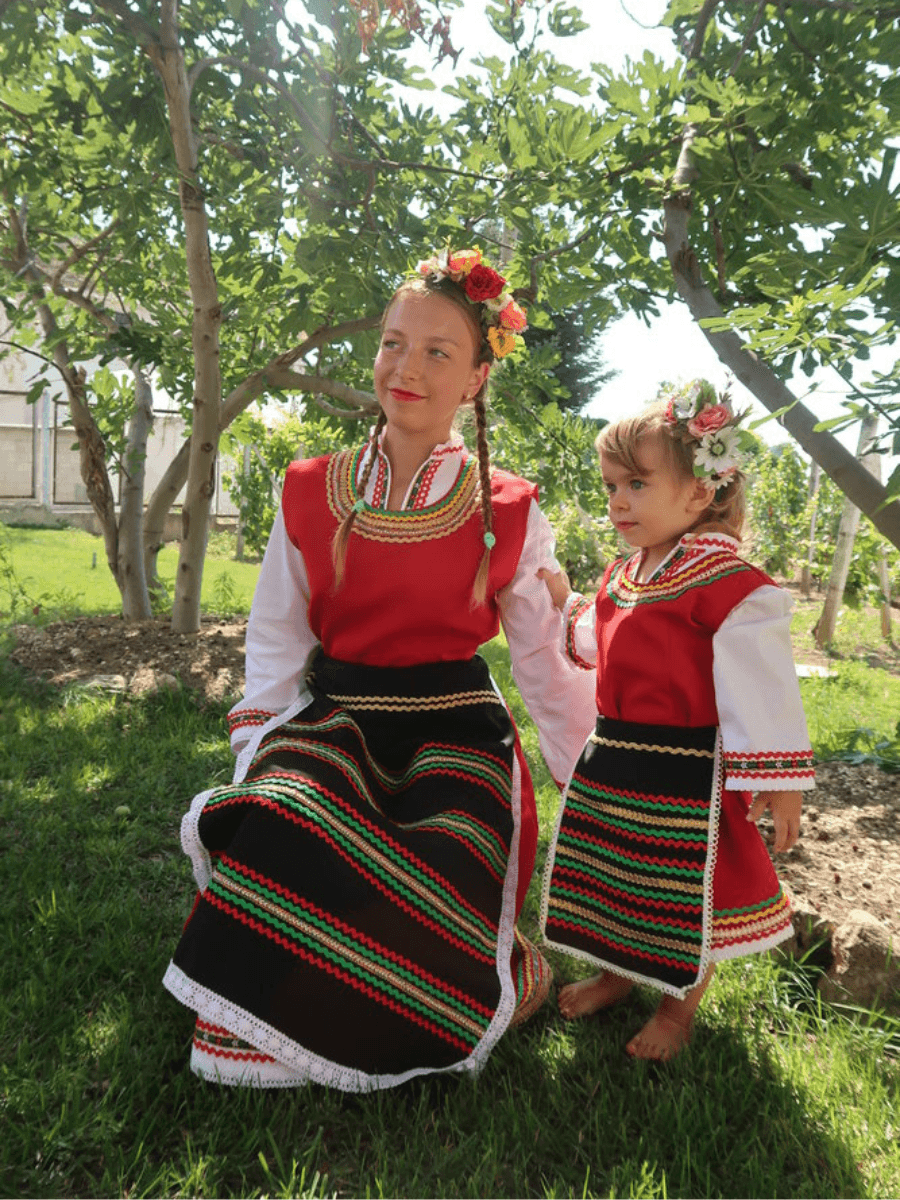 Традиционна Българска носия, изработена от габардин и памук и обогатена с фолклорни ширити, придаващи уникален стил и автентичен вид.