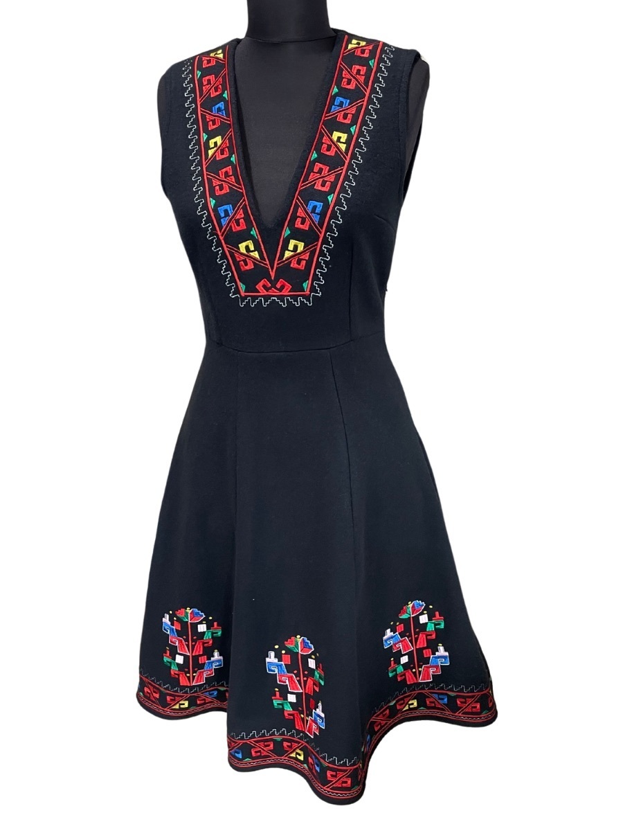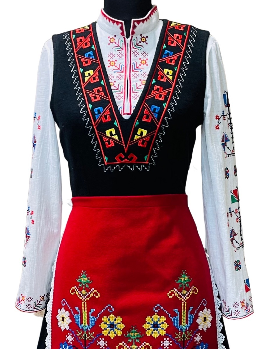 Дамска Тракийска носия, изработена от вълнен плат и памук и обогатена с бродерия на автентични шевици, придаващи уникален стил и автентичен вид.