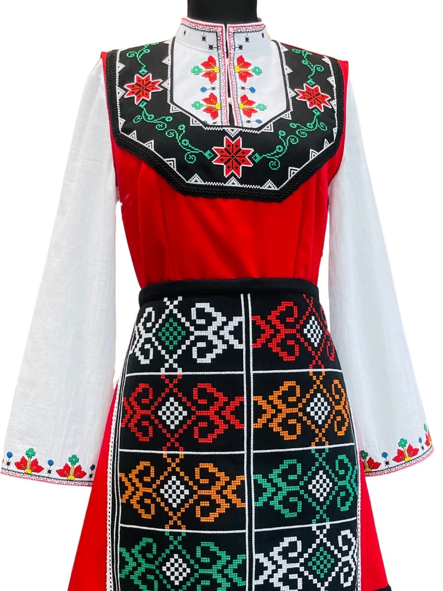 Дамска Тракийска носия, изработена от габардин и памук и обогатена с бродерия на автентични шевици, придаващи уникален стил и автентичен вид.