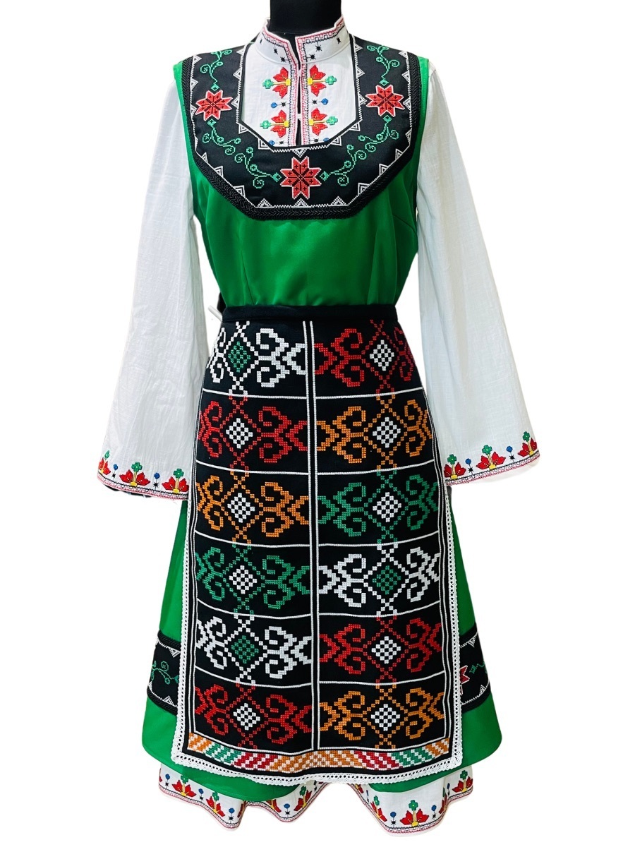 Дамска Тракийска носия, изработена от габардин и памук и обогатена с бродерия на автентични шевици, придаващи уникален стил и автентичен вид.