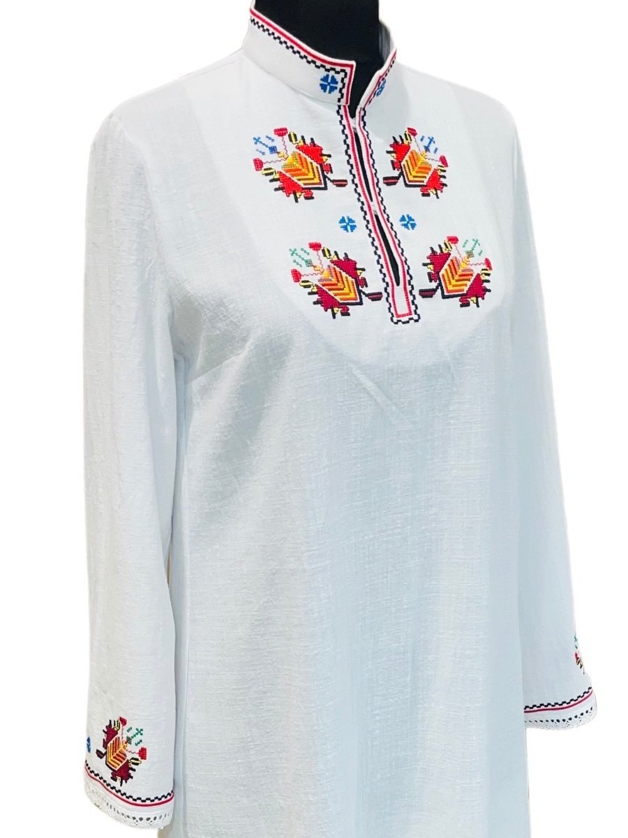 Модел 7 е класическа дълга риза, вдъхновена от традиционната българска кошуля. Дизайнът е богато украсен с автентични сливенски шевици, които носят духа на Тракия. Дължината под коляното я прави идеален избор за основа на народна носия или като самостоятелно облекло за специални фолклорни поводи.