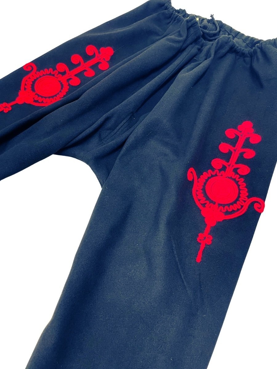 • Северняшки потури: Плътни и удобни, акцентирани с извити червени гайтани за автентичен завършек на долната част от ансамбъла.