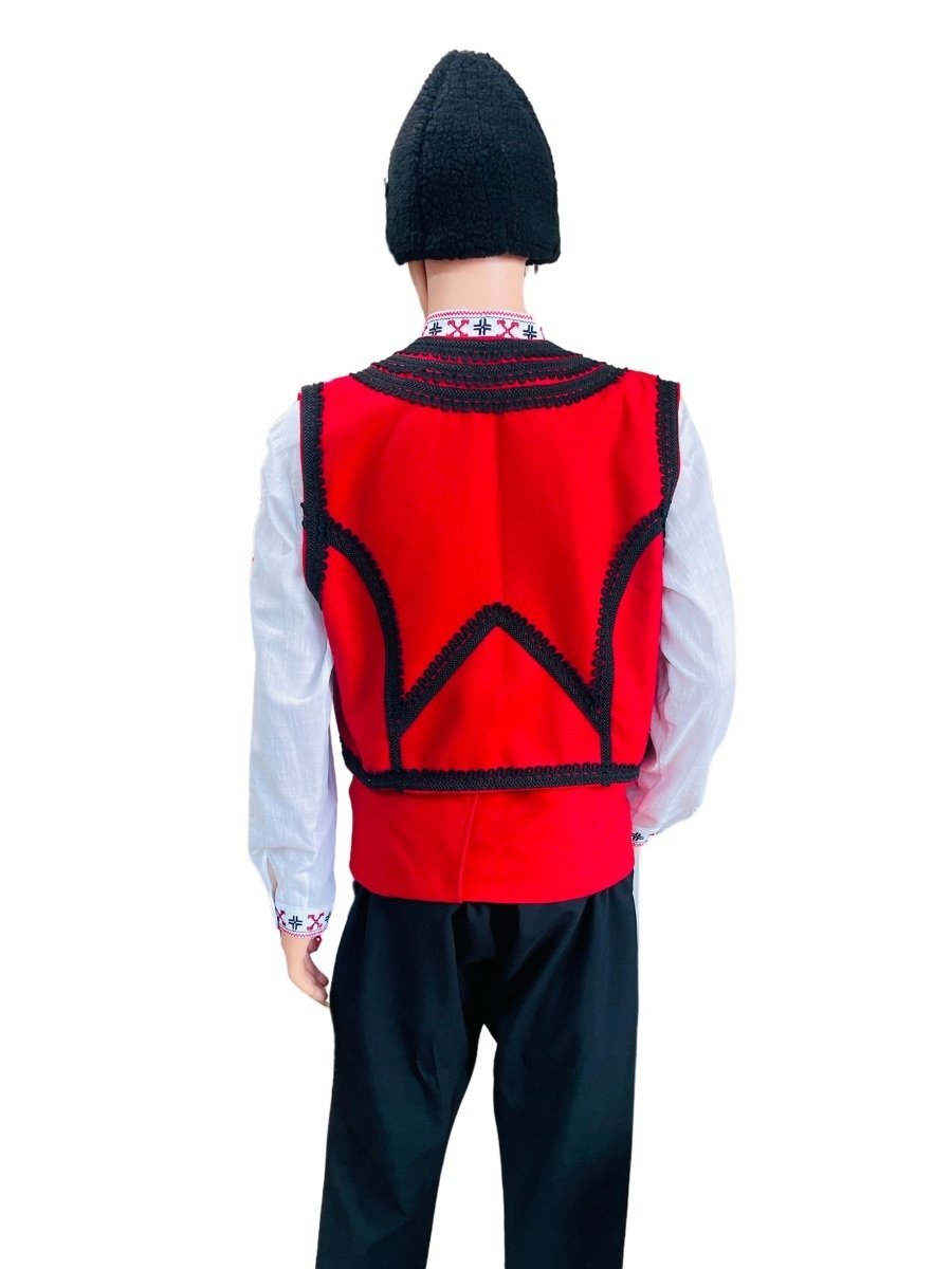 • Елегантен елек: Акцент в облеклото, майсторски декориран с черни гайтани, които подчертават мъжествения силует.