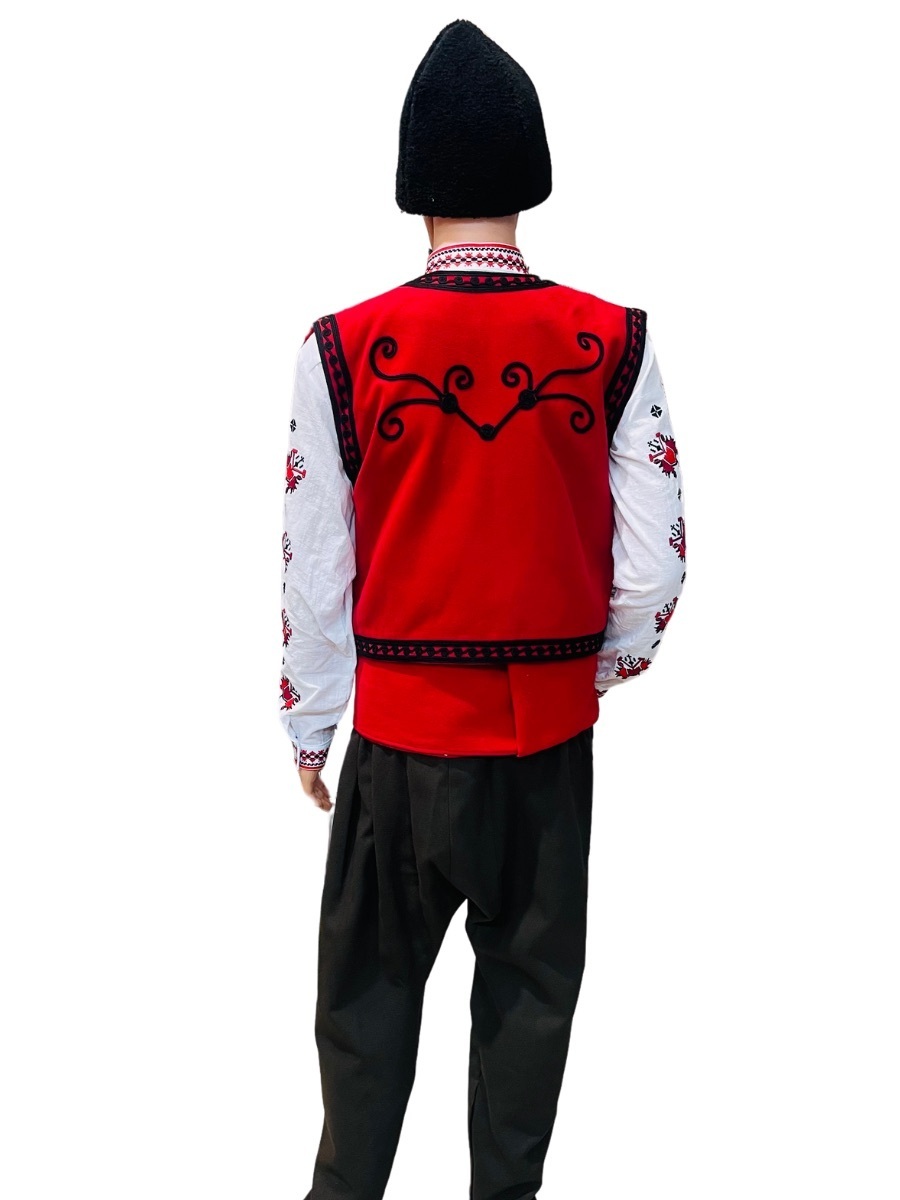 Традиционна Българска носия, изработена от вълнен плат и обогатена с бродерия на Автентични Тракийски шевици и гайтани, придаващи уникален стил и автентичен вид.