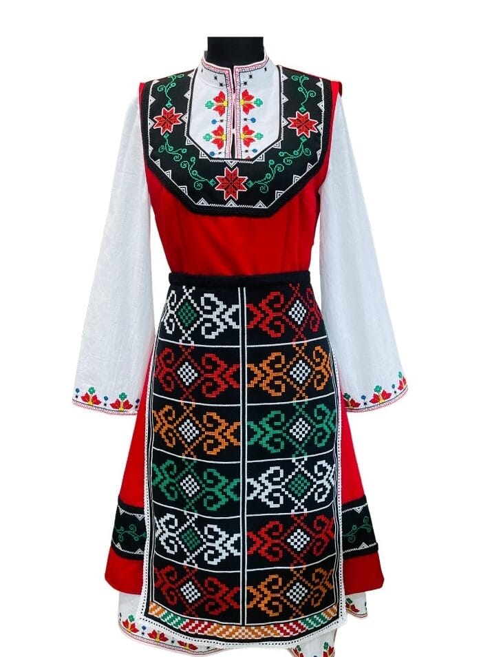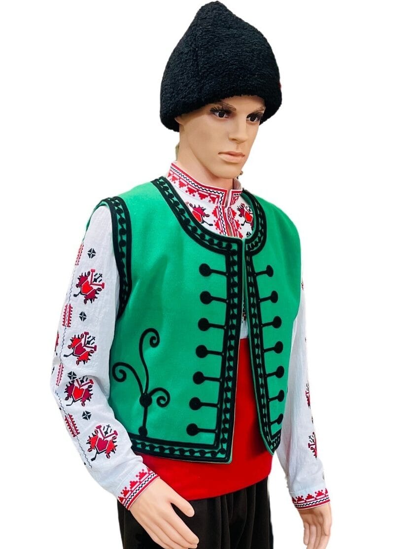 Традиционна Българска носия, изработена от вълнен плат и обогатена с бродерия на Автентични Тракийски шевици и гайтани, придаващи уникален стил и автентичен вид.