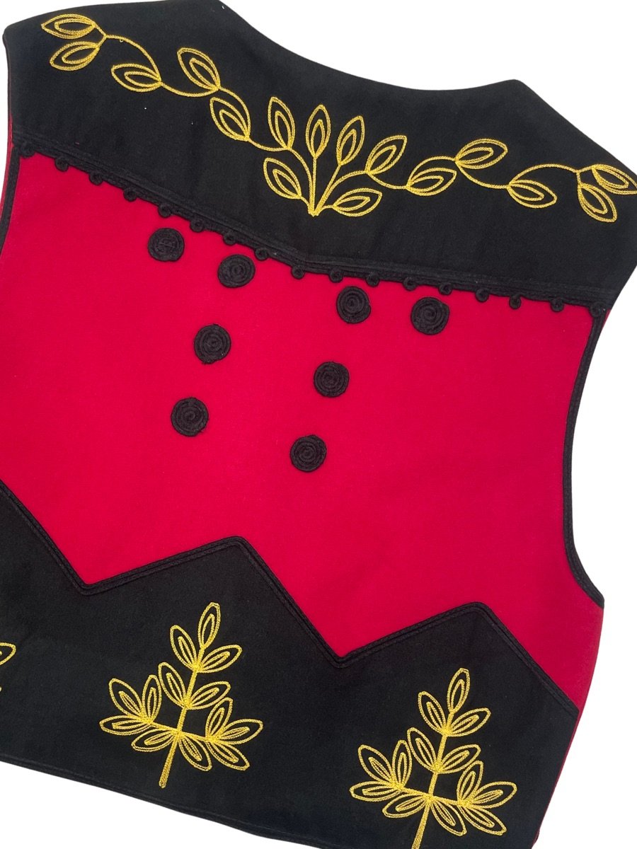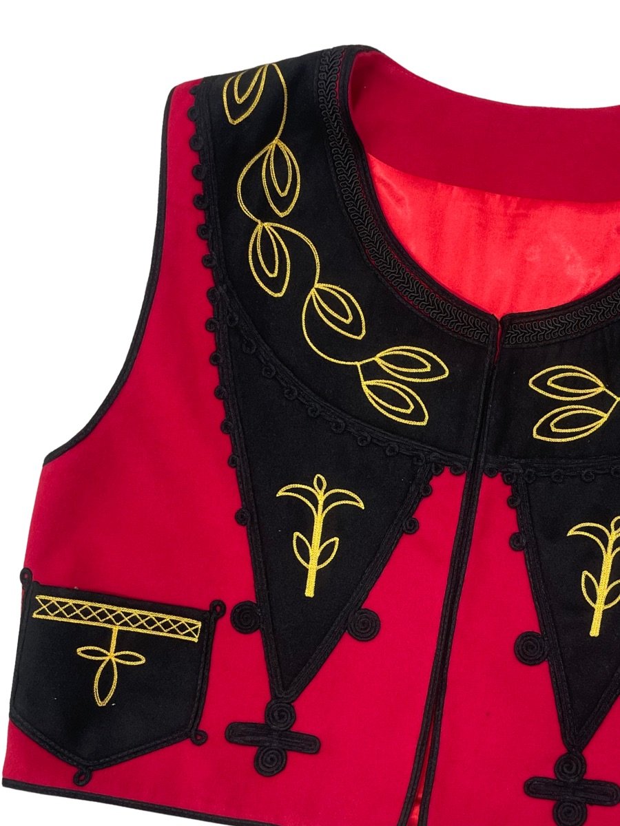 Отличителната черта на този модел са характерните за региона извити гайтани, които опасват елека с графична прецизност. Тези орнаменти са внимателно проектирани, за да подчертаят мъжествената линия на силуета, придавайки на раменете и гърдите по-внушителен вид. Всеки елемент от декорацията е поставен с мисъл за детайла, превръщайки елека в перфектния акцент, който привлича вниманието на всяко хоро или фолклорна сцена.