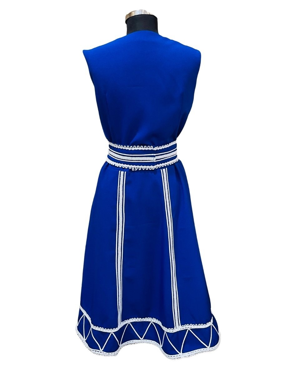 Този сукман се отличава с изключително богата декорация от ширити и гайтани, положени според каноните на шопската традиция. Цветовата гама залага на класическите за региона цветове – бяло, черно и синьо, които създават неповторим визуален ритъм. Прецизната подредба на украсата не само подчертава детайлите на носията, но и я прави изключително ефектна при движение и танц, превръщайки я в централен елемент на Вашето представяне.